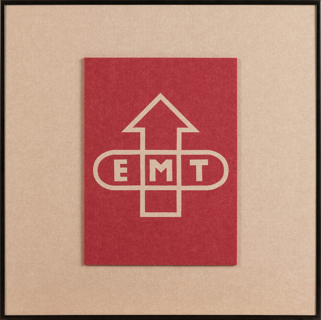 • Schallabsorption: Zum Einsatz kommt ein bewährtes Akustikmaterial – eine ca. 1 cm starke PET-Filzplatte, die stilvoll, bewusst und nachhaltig aus 60 % recycelten PET-Flaschen gefertigt ist. Das leicht erhabene EMT-Logo verleiht dem Motiv zusätzliche Tiefe und erzeugt einen eleganten 3D-Effekt aus Licht und Schatten. Farblich abgestimmt wirkt das Design edel und zeitlos.
