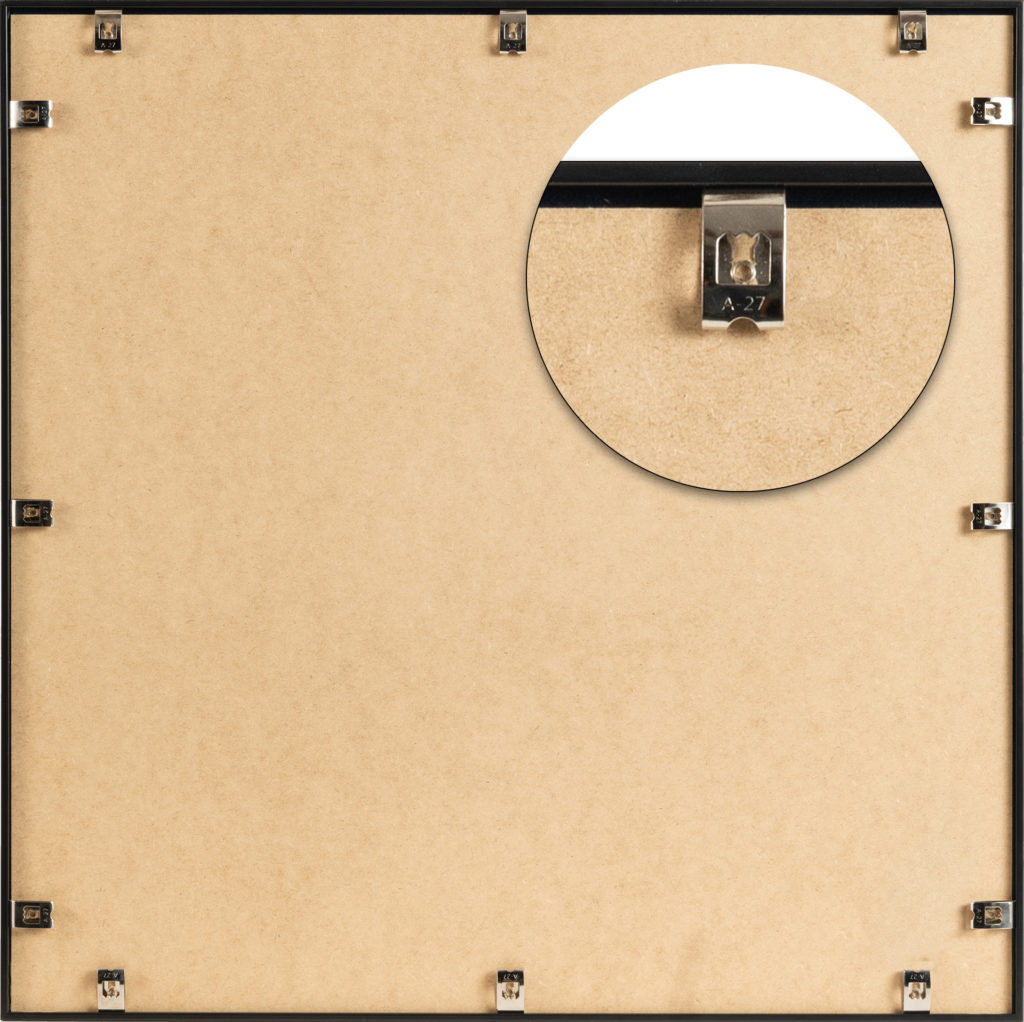 • Rahmenkonstruktion: Der Schallabsorber ist in einen hochwertigen, formschönen Bilderrahmen eingefasst, hergestellt in Deutschland. Das pulverbeschichtete Aluminium-Profil wird durch eine stabile HDF-Rückwand ergänzt. Die Aufhängung erfolgt über gezahnte Wechselclips, die zusätzlich mit Nieten an der Rückwand gesichert sind.